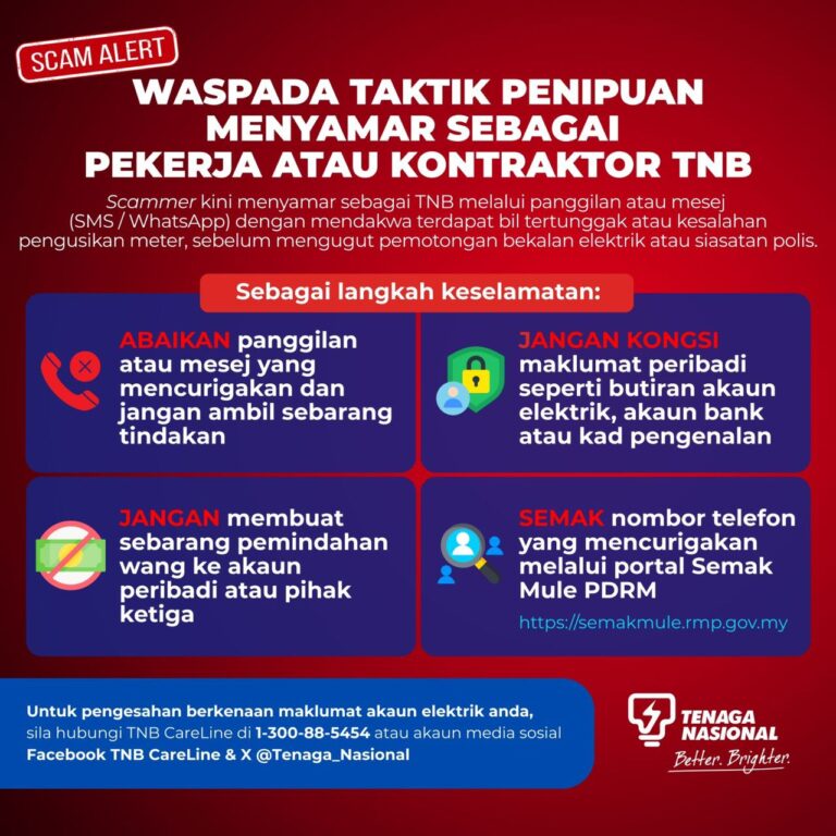 Sumber: Tenaga Nasional ⚠️ WASPADA TAKTIK PENIPUAN PENYAMARAN SEBAGAI PEKERJA TNBKami menasihatkan pelanggan agar berwaspada terhadap taktik penipuan scammer memperdaya pelanggan untuk memberikan maklumat peribadi dan membuat transaksi ke akaun individu atau pihak ketiga. 🔎 Semak nombor telefon mencurigakan melalui […]