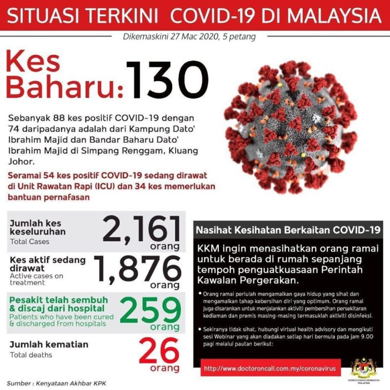 Kemaskini setakat 27 Mac 2020, jam 5.00 petang. 44 kes telah pulih dan dibenarkan discaj daripada hospital. Jumlah ini adalah yang paling tinggi pernah dicapai dalam satu hari. Satu berita yang sangat baik dan perlu disyukuri! Terima kasih dan tahniah, […]