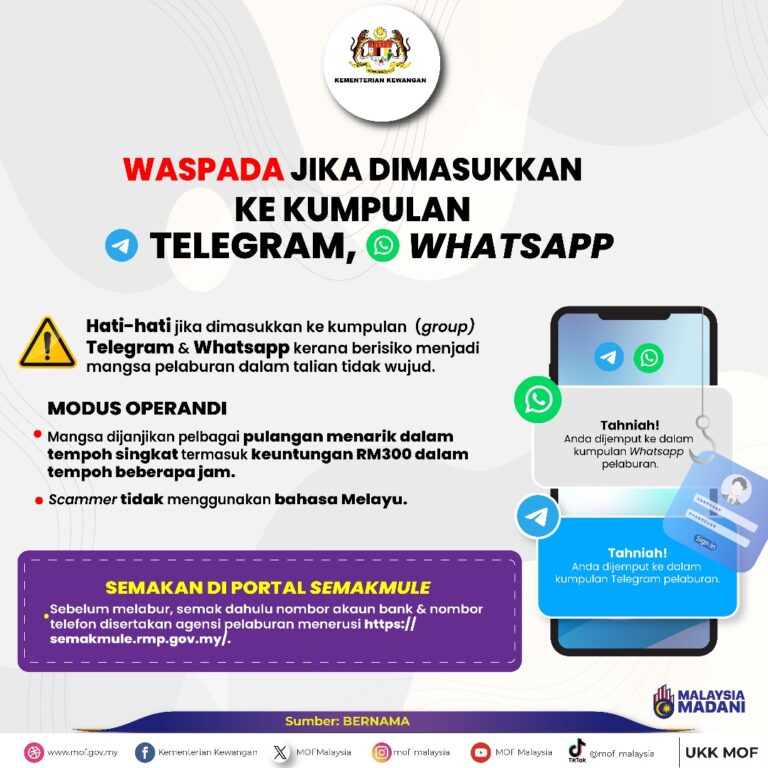 Menurut Kementerian Kewangan (MOF): MOF menegaskan bahawa hebahan mesej berkenaan bantuan ‘SARA untuk semua’ ADALAH PALSU! Berhati-hati dan jangan mudah terpedaya dengan mesej palsu seumpama ini di media sosial. Untuk makluman, tiada sebarang permohonan diperlukan bagi RM100 SARA. RM100 SARA […]